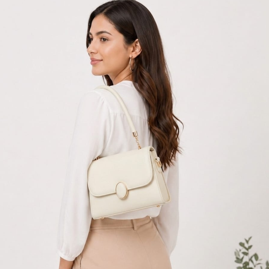 Iconic Design: Features a unique gold-tone oval buckle on a clean white flap, giving it a high-end designer appeal.