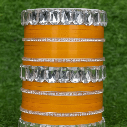 Enhance your bridal look with this elegant set of red chura bangles. Crafted with a glossy red finish, these bangles are beautifully decorated with sparkling white stones and square-cut embellishments that add a royal touch. Perfect for weddings, festive occasions, and cultural events, this bangle set combines traditional charm with modern elegance, making it a must-have for every bride’s jewelry collection.